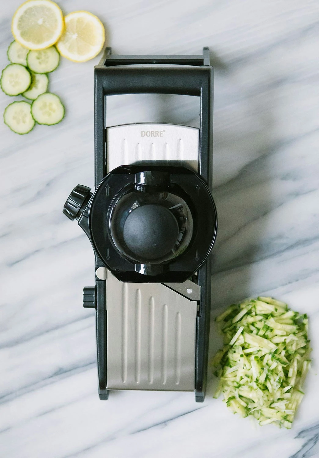 The mandolin by Dorre has a sharp blade in stainless steel to cut vegetables. The mandolin has a comfortable handle in plastic.
